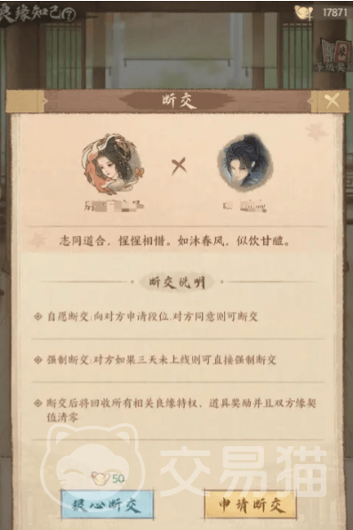 当然,若你与知己的关系走到了尽头,也有简单的解决方式。只需一方在离线超过一定时间,就能发起解除知己关系的请求。如果另一方同意,就能顺利断开。如果不同意,那你就只能花费一些元宝来强制解除。需要注意的是,解除关系后,双方共同提升的等级会清零,所有称号和特权也都会回收,所以在做决定之前,想清楚是不是放弃一段珍贵的伙伴关系。