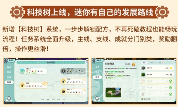 新版本最引人注目的便是科技树系统的加入,玩家们将可以一步步解锁各种制作配方。告别死磕教程的苦日子,开始了真正的自我探索和发展。每一个科技点的解锁都像是在打开新世界的大门,让你在游戏的世界中畅快游走,充满了探索与发现的乐趣。同时,任务系统也迎来了升级,无论是主线任务、支线任务还是成就任务,都得到了更加清晰的划分。这个优化不仅让任务完成更有目标感,还让奖励更加丰厚,操作起来也更加流畅,绝对让你玩得不再烦躁,尽情享受任务带来的乐趣。