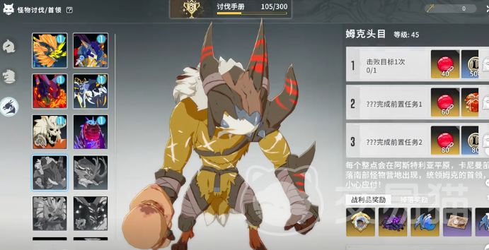 玩家在确认三牙的位置之后,就可以马上去寻找45级的姆克头目,这就是一个巨型的装甲怪物,身边还会有红色的特效,玩家还需要注意这一路上的小怪。在缓慢靠近boss之后就可以触发战斗,然后以直线的方法去奔跑。