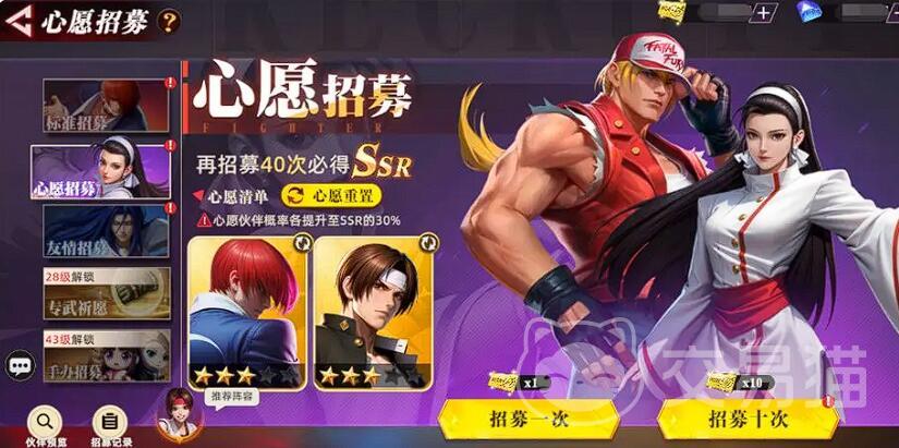 心愿招募是突破战力瓶颈的核心路径,需从锁定双核→保底预留→羁绊联动策略。40抽保底机制要求玩家精准计数,结合副本时段与专武配套,方能使草薙京的群伤与八神庵的收割能力最大化,制霸竞技场与高难副本。