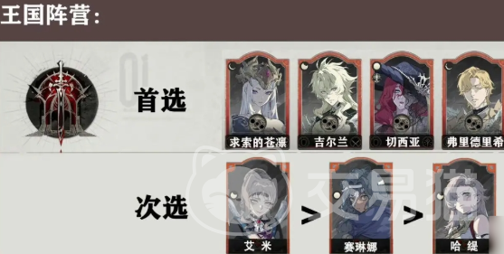 王国阵营:可以选择求索的苍凛、弗里德里希、莱夏。求索的苍凛是一个具备护盾的奶妈,在游戏初期就可以使用。弗里德里希和莱夏这两个都会有各自的用处,因此在阵营中也是不应该被忽视。接着还可以选择切西亚,还有赛琳娜。如果有归乡的诺亚,那就可以直接把切西亚放入到心愿单中。如果在游戏中要是缺少输出线的角色,大家也可以选择哈缇,在公测的过程中就会直接赠送一个可以满足玩家的需求。