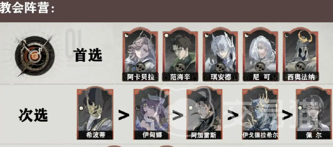 教会阵营:在这一个阵营中,建议大家选择阿卡贝拉+希波蒂+西奥法纳+伊甸娜。阿卡贝拉可以带来攻击速度加成,还有治疗,自身所具备的法术伤害也会比较高。范海辛属于一个远程输出性的角色,而且实力比较出色,一般是在推主线的时候使用。西奥法纳就是一个相对比较好用的前排,可以直接打断敌方的嘲讽。然后另外的这两个也可以值得关注,除此之外玩家也可以选择阿加雷斯或者是多蕾丝,这到底该如何挑选?可以根据个人的实际喜好。