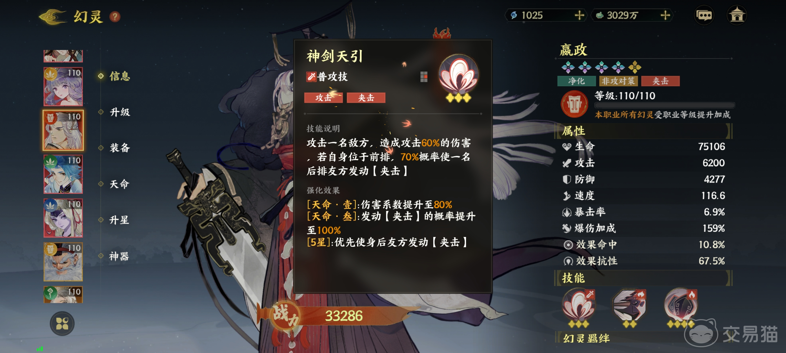 神剑天引是嬴政的普攻技能,该技能最大的效果就是攻击以及夹击,使用该技能以后,嬴政可以对前方的一名敌人发动普攻,攻击目标回受到60%的伤害,若是嬴政处于前排位置的话,还有70%的概率可以和一名后排队友发动夹击的效果。