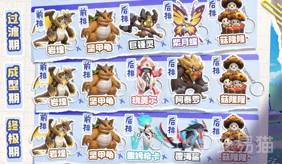 阵容搭配方面,前排角色可选择坚甲龟,巨锤灵,后排则是珑美尔+阿泰罗+菇隆隆;第二种搭配前排可选择坚甲龟和岩煌,后排由珑美尔,阿泰罗,菇隆隆组成。
