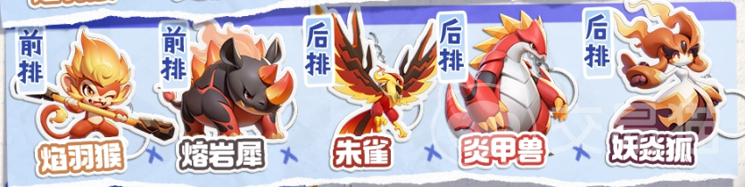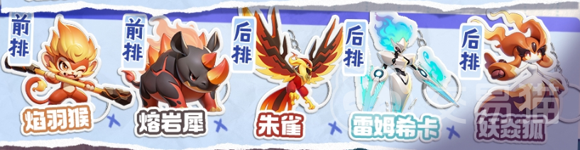 第二套:焰羽猴+熔岩犀+朱雀+炎甲兽+妖焱狐;这就是大家角色比较多之后,更为通用的搭配了;还有最后一套完善成型的配置,焰羽猴+熔岩犀+朱雀+雷姆希卡+妖焱狐,这种配队就能很好的将猴子的优势发挥出来。