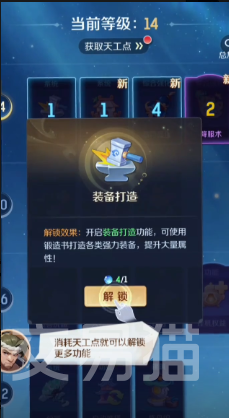 如果玩家的角色等级达到14级,那自然就可以解锁装备的打造,然后跟着步骤就可以轻松的开启。玩家找到装备打造的图标,只需要消耗4点天工就能直接解锁,在解锁之后系统会提示解锁成功。也就意味着正式激活装备打造。