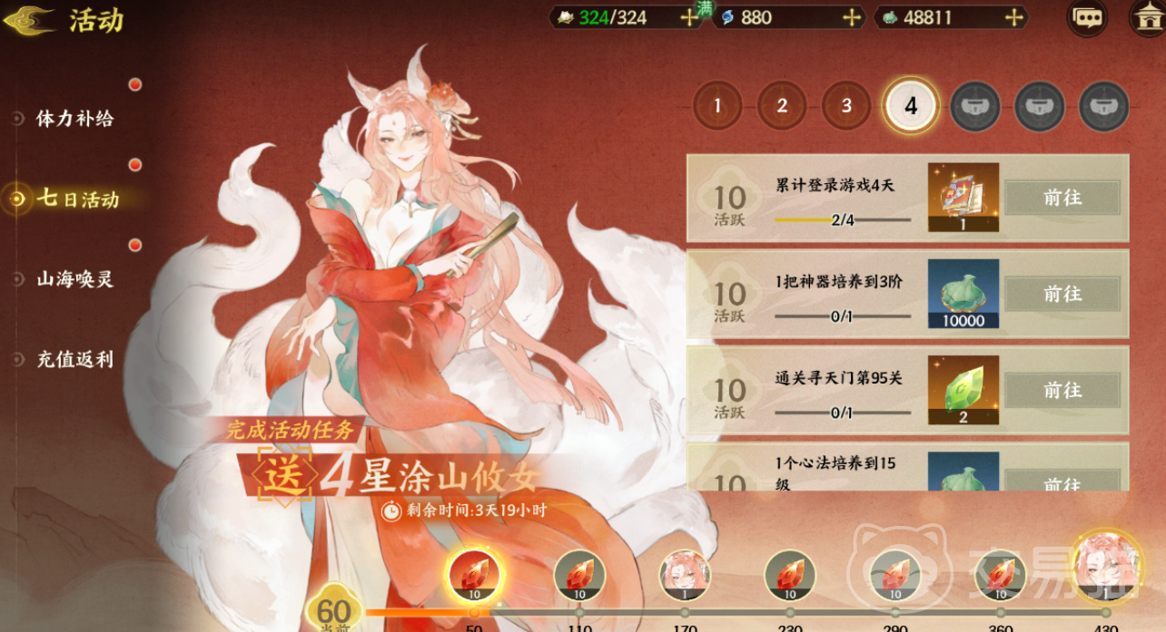 七日活动玩家只要把每天的活动全都完成就能获得4星传说级别的幻灵涂山攸女,涂山攸女虽然是控制型辅助幻灵,可是它的能力却极为的强大,战斗中的涂山攸女有着群体减速以及减攻的能力,有了这个幻灵,我们推图的速度会直接翻倍。
