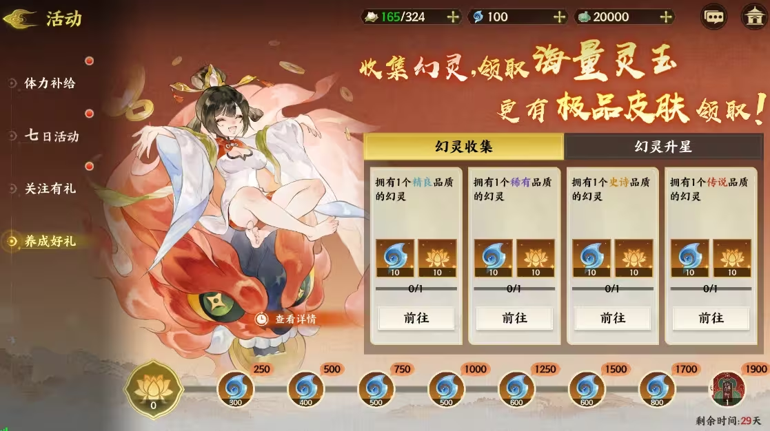 每天完成主线通关还能免费获得200次抽卡的机会,其中有155抽普通卡池抽卡机会以及35抽神器抽卡机会,这里建议玩家可以先去限定卡池抽后羿,只要抽够50抽就肯定能得一个传说级幻灵,抽100抽触发保底机制肯定能得后羿。