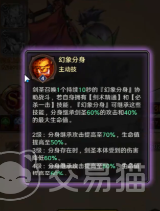 主动技能幻象分身可以召唤出一个自己的分身,分身可以持续10秒钟,剑圣召唤出来的分身可以继承自身60%的攻击以及40%的最大生命值。
