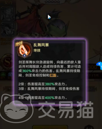 剑圣之所以是后期必不可少的英雄,主要是因为他的技能伤害实在是太高了,他的绝技乱舞风暴是一个可以给敌人造成360%伤害的技能,使用该技能以后,剑圣会挥舞着长剑快速的进行旋转,一边旋转还会一边向附近的敌人靠近,该技能在给敌人造成持续伤害,其累计伤害最高能够达到360%,在乱舞风暴使用期间,剑圣还将会带有免疫控制以及打断的能力。