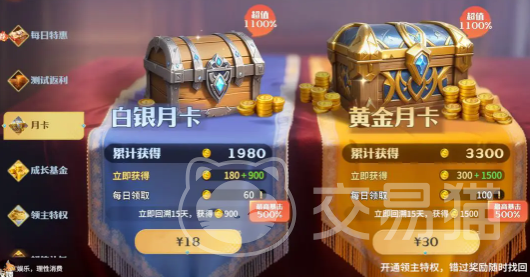 月卡会分成两个档位,一个是18档,一个是30档。18档主要是60个龙石,可以累计1980龙币。30元档主要是100个龙石,可以累计3300个龙币。