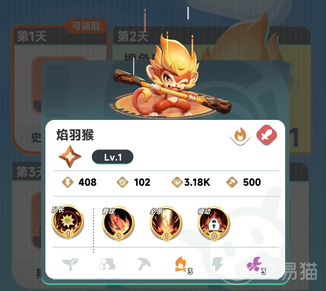 第3个推荐的是焰羽猴,这是通过签到就可以直接获取到的,上手难度很低。普攻能对单个敌人造成高额伤害,每次普攻提升自身暴击率。必杀技通过蓄力,对单个敌人造成输出,并对自身进行治疗,暴击之后会追加范围伤害。被动能够提高暴击伤害,也是输出非常给力的一个。