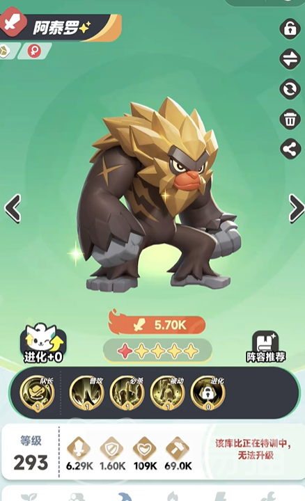 阿泰罗的外形是一个类似猩猩的宠物,其所有技能都是跟岩石相关的,他的被动技能是根据我方岩石属性的数量来提升自己的伤害以及免伤率,也就是全队都是岩石宠物的话,那么这个被动的转换率是最高的,这也是推荐这个角色选择纯岩队伍的理由。