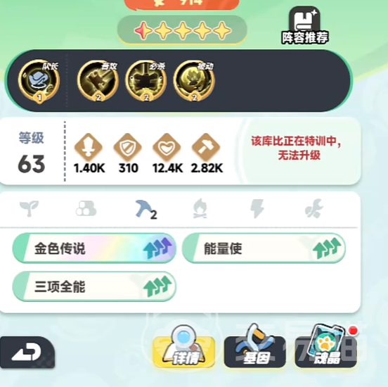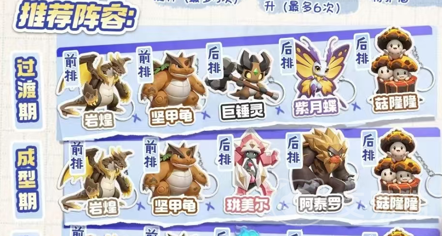 最后就是阿泰罗的配对方面,由于奥泰罗的被动只能跟岩石属性生效,所有队伍里基本上 都是岩石宠物,输出的话可以推荐岩煌和阿泰罗作为主要输出,而肉盾的话选择肩甲龟,可以抗住巨额的伤害,后排的两个辅助角色可以选择菇隆隆以及美尔,这样岩石队伍的全能型就体现出来了。