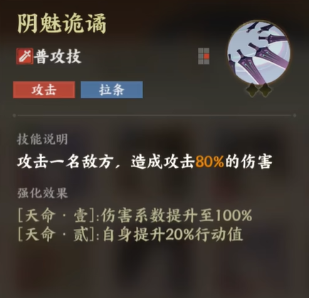 首先要了解的是,聂小倩的普攻技能“阴魅诡谲”不仅是一个简单的攻击技能,它还是一个能为她铺路的关键能力。基础伤害看起来可能不算高,但通过她的天命加成,伤害可以轻松提升到100%。更为重要的是,她的天命二能提升她的行动条,意味着你可以更快地再次行动,先发制人。想想看,敌人都还没来得及反击,她就已经开始第二轮攻击了。