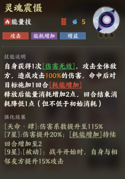 最后,说到聂小倩最具特色的技能——“灵魂震慑”,这可是一招改变战局的绝技。它不仅能够造成强力的全体伤害,还是一个能对敌人施加“耗能增加”状态的控制技能。敌人的能量消耗增加,意味着他们释放技能的频率将被大大降低,而这也正是你赢得战斗的关键之一。特别是在能量消耗提升后,敌方的反击能力会受到极大抑制。她的天命四和七星强化后,不仅伤害更高,耗能增加的持续回合数也得到了提升,进一步加强了她的战斗节奏。