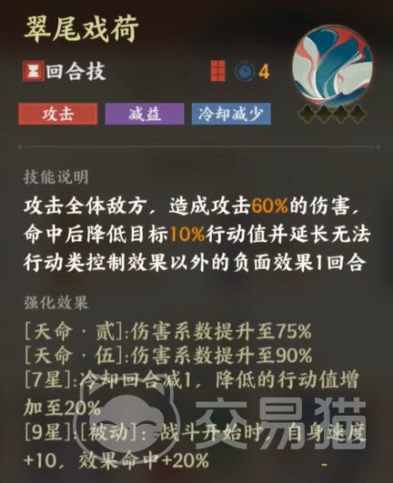 谈到西施的回合技“翠尾戏荷”,她可以说是一个极具战略眼光的角色。攻击全体敌人,带来的不仅是伤害,最重要的是她能有效削减敌人的行动值,并在敌人身上延长各种负面效果的持续时间。这样一来,她不仅打击敌人的攻势,还能为自己的队友争取宝贵的行动机会。随着强化效果的提升,她的伤害输出也逐步增强,尤其是达到7星后,冷却时间缩短,行动值的削减效果也更为显著。更强的是,当西施在战斗开始时,她的速度会得到大幅提升,让她在战斗中掌握先机。