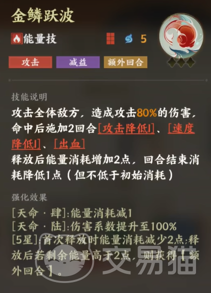 最后要介绍的就是西施的能量技能“金鳞跃波”。这一技能不仅在伤害上表现不俗,更是在敌人中播撒一连串的负面效果,削弱敌人的攻击、速度,并让敌人流血。最为致命的是,西施使用这项技能后,如果能量高于一定数值,她会获得一次额外的回合,这意味着她能够在敌人毫无防备时,继续施加压力。如果你能巧妙地运用她的技能时机,西施的“金鳞跃波”会是改变战局的关键。