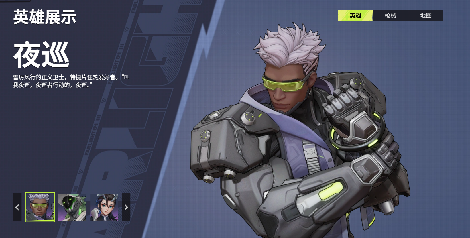 夜巡是一个擅长控制机器来帮助自己作战的英雄,即便是新手使用,他也能给敌方带来很强的压迫感。技能1能召唤出一个机械警长,它能对敌方造成持续的伤害,且没有时间的限制,只要它还存在,就会一直攻击,同时角色还能对它进行指挥,指挥它去往想让它去的位置,这样是很有利于大家去攻击一些处于掩体后面的敌人的,敌方只能选择打破警长,或者是进行转移;升级后的警长将额外获得激光导弹的功能,能对敌方目标产生进一步的威胁,满级还有额外的减速效果。