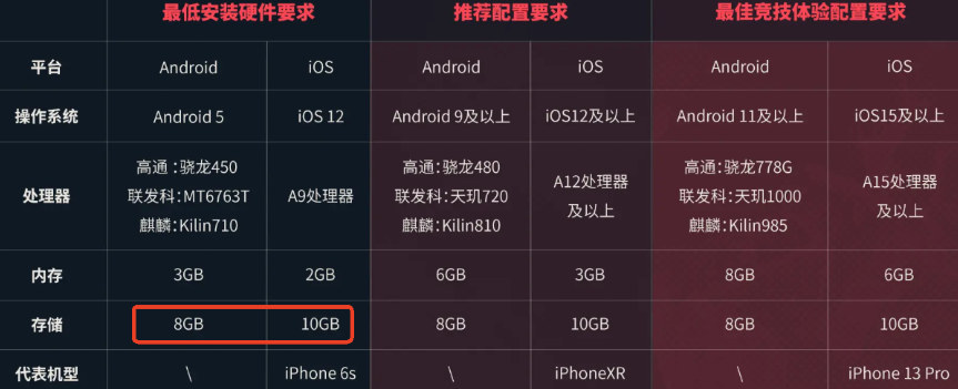 官方给出了三档配置要求:最低安装硬件、推荐配置与最佳竞技体验配置。只要设备满足最低配置要求即可成功安装并运行游戏。安卓端,最低安卓5.0系统,骁龙450、联发科MT6763T或麒麟710,内存3GB,存储空间预留8GB即可。iOS端则是A9芯片,2GB内存,10GB储存。