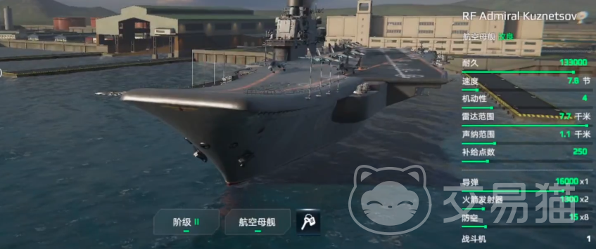 库兹涅佐夫号,“老牌”二级航母,曾经无人能敌。搭载配置包括一枚导弹、两门火箭炮、一架攻击机、一架战斗机和一架直升机,以及八门防空炮,这样的武装组合使其在对空、对海两个维度都拥有不俗的输出能力。不过,速度和机动性较差的,使其容易成为敌方火力集火的目标。