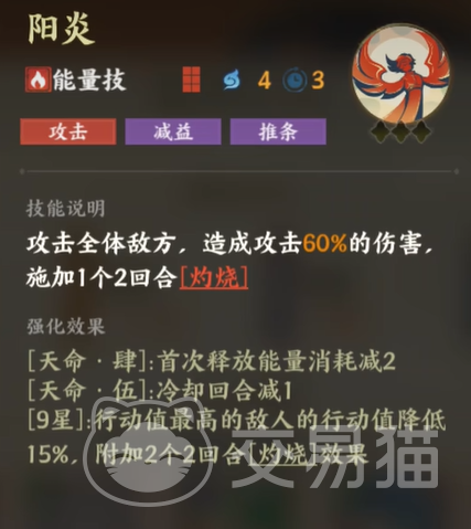 最后,还要介绍一下金乌的能量技“阳炎”。它的这项技能给敌人带来的不仅仅是伤害,更多的是致命的减益效果。当金乌发动“阳炎”时,它对敌方全体发动攻击,造成不小的伤害,还能在敌人身上施加持续性[灼烧]效果。尤其是技能强化后,它能够减少能量消耗、缩短冷却时间,增加对敌方的压制力。当敌人最强的单位被金乌的技能锁定时,痛苦才刚刚开始。多个[灼烧]效果叠加,敌人将陷入一种无力反抗的状态。