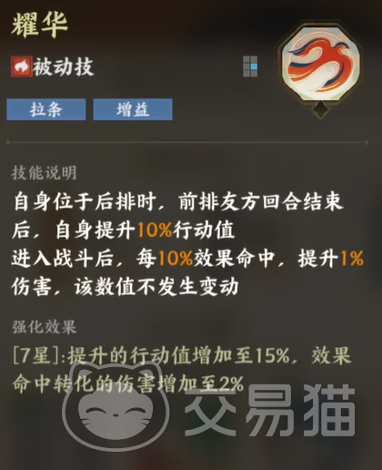 再看看金乌的被动技能“耀华”。它的独特之处在于,它不像其他角色那样只专注于自身,而是关注队友的行动。当金乌在后排时,它能巧妙地与前排队友配合,每当前排回合结束,金乌便能获得额外的行动值提升。提升不仅仅是简单的增益,它还能够将行动值的增加转化为强劲的伤害加成,这使得金乌在后期的战斗中,攻击力不断暴增,给敌人带来致命一击。