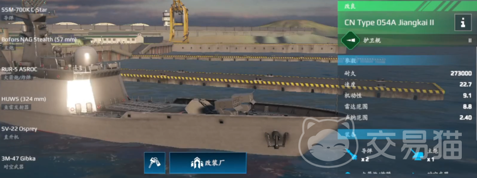 054A,搭载了2枚导弹、2门火箭炮、2组鱼雷发射器以及一门主炮,在火力方面分布合理,能够胜任多种战术需求。虽然它的对空火力略显不足,但在二级房环境中依然属于全面强力的存在。