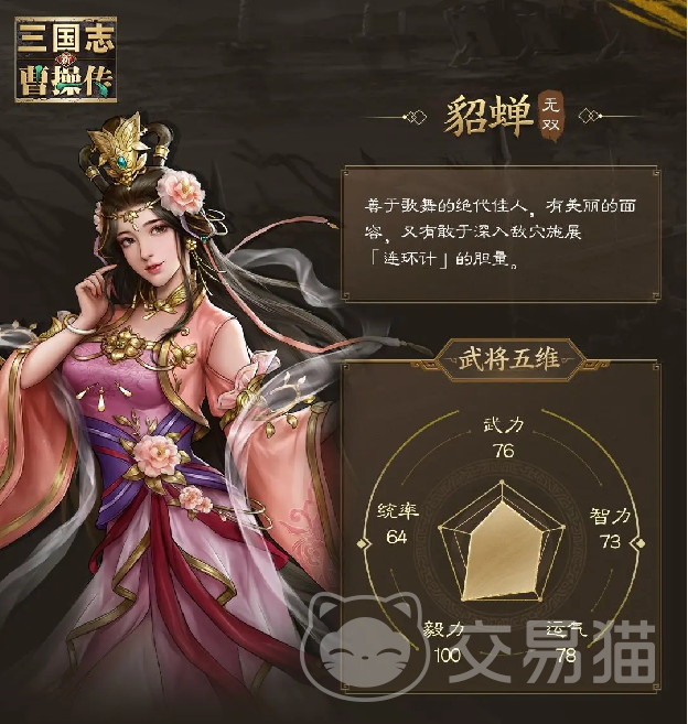 新三国志曹操传貂蝉怎么玩?貂蝉这个角色相信大家多多少少都有耳闻,她一直以令人惊叹的美貌闻名,虽然并不是五大三粗的武将,但是在战场上也能以独一无二的计谋奠定了她无法替代的地位,冲着她的颜值相信都有很多朋友想要领略该武将的魅力,下面就一起学习下她的技能玩法吧。
