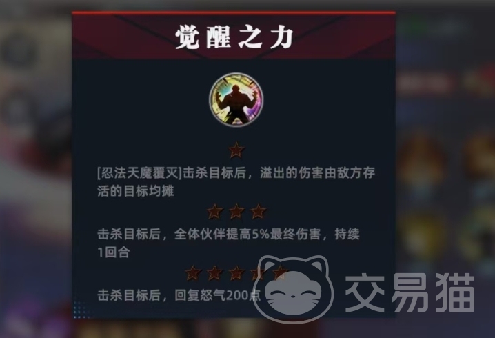 在觉醒之力的加持下,服部半藏的怒气技能也会有变化,如果使用技能后输出还有一定的溢出数值,就会分摊给敌方目前存活的敌人身上,这一机制解决了战斗中常见的伤害溢出问题,使得服部半藏的每一个攻击都能够最大限度地对敌人造成伤害,同时只要成功击杀目标,服部半藏的队友们便能够提高5%的最终伤害。