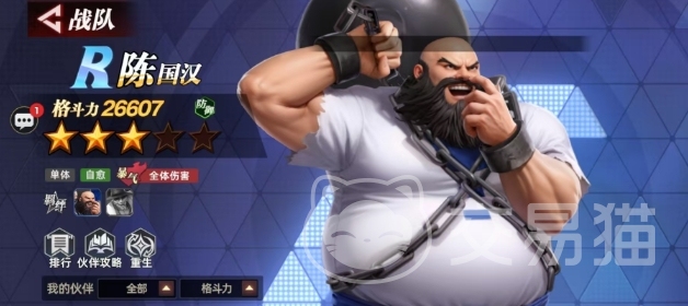 在全明星系列的格斗世界里,陈国汉一直都是一位极具特色且令人难以忽视的格斗家,而在本期的全明星觉醒游戏当中也是有陈国汉这个角色设定的,如果这个角色的形象深入人心,那么全明星觉醒陈国汉怎么样今天就由小编来介绍吧,这个角色的品质并不算游戏中很厉害的品质,但是前期大家用他还是可以在很多挑战中拿到优势的。