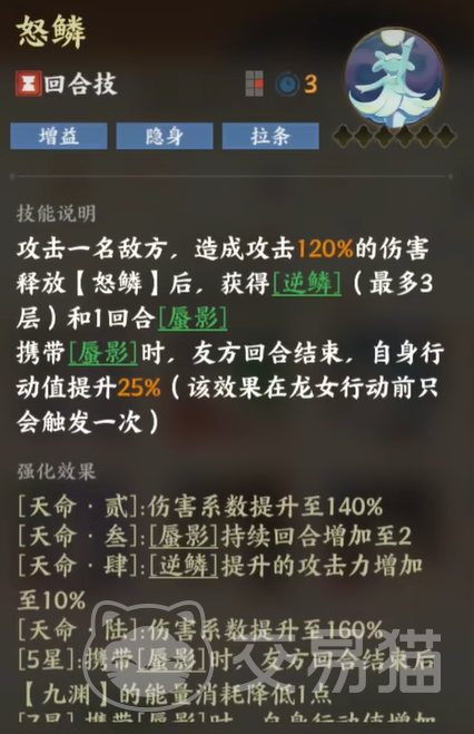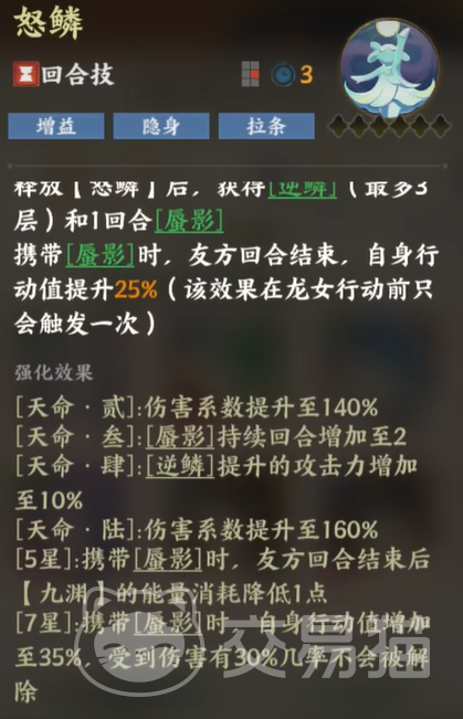 说到龙女的核心技能,“怒鳞”是她的标志性技能之一。这个技能不仅能造成120%的攻击伤害,还能在释放后给自己带来一系列强力增益。首先,她会获得一个名为“逆鳞”的状态,这个效果可以提升她的攻击力,而随着龙女的天命进阶,逆鳞的攻击提升将变得更为恐怖。技能的另一大亮点是“蜃影”状态,这让她在敌人回合结束后,能为自己加速行动,提升自己的行动值。这种“拉条”效果能在关键时刻让龙女迅速行动,再次发起致命一击。