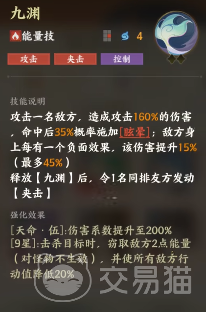 至于“九渊”这一终极技能,它的威力不仅在于伤害本身,还在于它的控制效果。攻击敌人后,有35%的概率让敌人进入眩晕状态,这意味着敌方在接下来的回合内无法行动,失去了宝贵的战斗机会。而且,九渊还具备特殊的“夹击”效果——只要敌人身上负面效果越多,龙女的伤害就越高,最多可增加45%的伤害。通过这项技能,龙女可以在敌人积累负面状态时,迅速打出致命伤害。