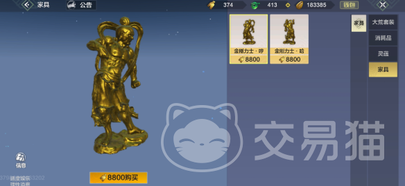 进入商店之后,玩家可以选择购买消耗品或者是大荒套件,也可以选择购买家具。在家具方面有金刚力士哈,还有金刚力士亨。在消耗品方面有友谊之剑,还有友谊之功,另外还可以获得碎空天火弩。这就意味着玩家可以轻松地获取自己所想要的东西,能够有效满足日常的使用需求。