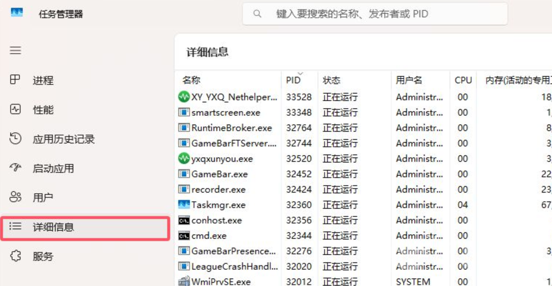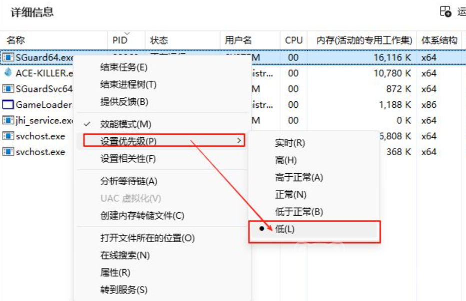 然后任务管理器里点选“详细信息”,从上面的搜索栏找到"ACE”,然后可以找到一个名为“SGuard64.exe”、“SGuardSvc64.exe”这两个程序,右键这些程序,在出现的右键菜单中勾选上“效能模式”。然后再在“设置优先级”的下级菜单中勾选“低”。