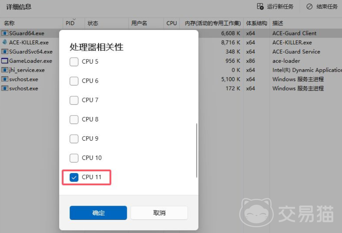 到这一步还没有结束呢!再选择“设置相关性”,可以设置将这个程序的挂载到某个CPU的单个小核心上,这样就可以避免“ACE”占用到CPU大核心的资源,进而影响到游戏的稳定性了。