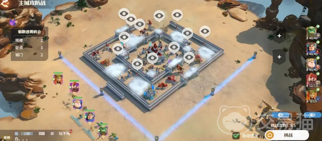 在进入玩法之前,要先设置自己的进攻阵容,布置好主城的防御布局以及阵容。在进攻时,除了要提高战力之外,还有一些需要注意的店,要观察敌军的布局,搞清楚敌人的整体建筑布局,龙石结界位置。