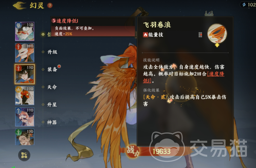 技能方面,指间山海精卫普攻技能光羽,锁定目标一名,伤害与精卫的速度挂勾,精卫速度越快伤害越高。强化技能后,出现天命壹时,攻击后自身暴击率提高10%。能量技能飞羽卷浪,AOE技能,精卫速度越快,伤害越高,并且有机会给敌人叠加DeBuff,速度降低25%,效果持续2回合。强化到天命叁以后,自身暴击伤害提高5%。技能机制比较简单。