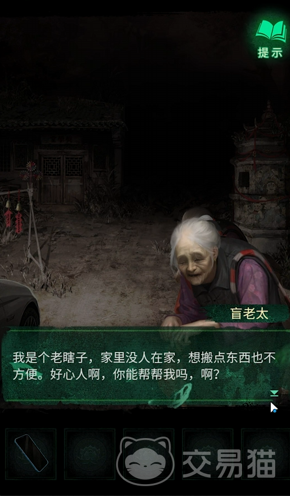 当踏入第二章,首先映入眼帘的是一个透着诡异气息的场景。初始在村口位置,地上摆放着几个篮子,你需要依次点击每个篮子,从中拾取到玩具手枪、火柴以及木头哨子这几样关键道具。紧接着,切换场景来到小卖部窗口,把刚刚拿到的木头哨子拖进去,这时就能顺利获得豆奶。随后回到村口,有一座古塔,将豆奶拖进古塔之中,便可得到门神画像。拿着门神画像,切换到有门的场景,点击右侧的门,把门神画像拖拽上去,门便会打开,进入屋内。