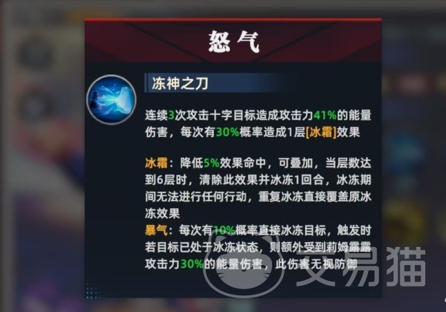 至于冰霜效果所带来的影响,那便是可以有效地降低对方的效果命中,并且这种效果还能够叠加,当冰霜效果成功叠加到6层之时,便能够触发冰冻效果。一旦敌方被冰冻住,那么在冰冻期间,他们将无法进行任何行动,这是一种非常有效的控制手段,能够在很大程度上打乱敌方的战斗节奏,为己方团队创造出更多的进攻机会。