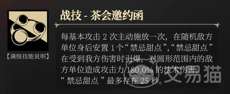 再谈谈他的战技茶会邀约函,这个技能有着独特的触发机制,每攻击两次,该隐是可以主动使用这个战技的,这个技能跟甜点有关,甜点相当于是待爆的炸弹,需要该隐使用战技去放在敌人的身边,然后当甜点受到伤害时,就会瞬间引爆,达到180%的法力输出效果,且甜点在敌人身边是可以存放25秒时间的,在这漫长的25秒内,也是可以让一些敌人不能靠近的,所以也属于是一个可以避险的招式。