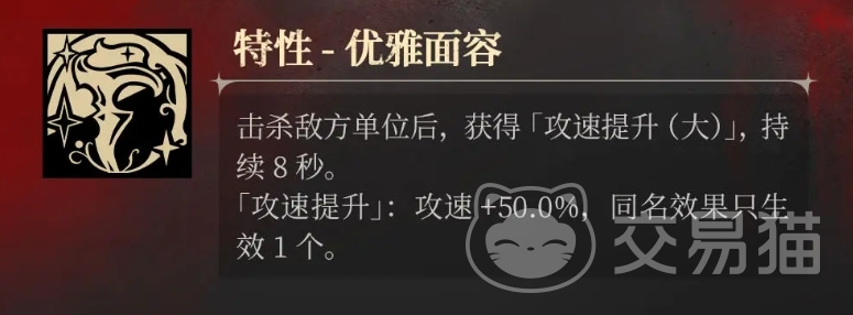 该隐的特性是在击杀敌方单位后带来的攻速增益效果,这个效果能够持续8秒钟,值得一提的是这一攻速提升幅度相当可观,能够增加50%的攻速属性,在快节奏的战斗中,这样的攻速就让整体队伍的输出攻击频率更快,而且像这样高的攻速提升效果还是很少见的,因此一般情况下,如果跟该隐在一起的优辅助,那么其他的增益辅助其实也不用给该隐增加效果了,他就用这个攻速增益其实也足够了。