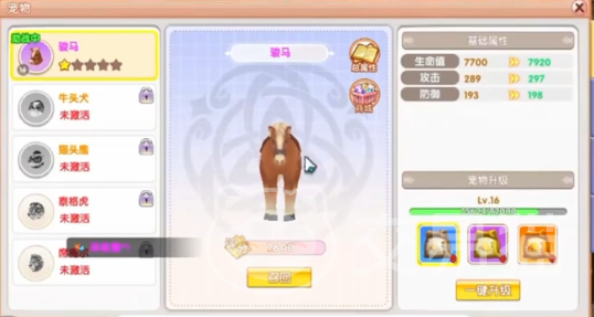 骏马这一个宠物一般可以给他进行一些升级,可以看到里面会拥有多个不同的属性,还有一些是从其他的地方带过来的,例如可以直接通过商城购买。从金币这一方面来看,可以看到有60万,如果是终身限购,那么就是300万。