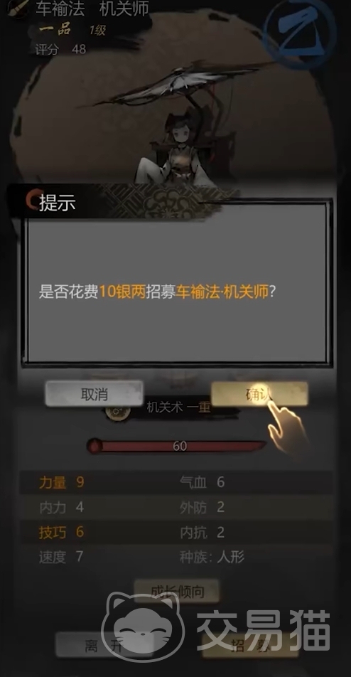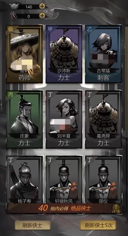 要注意,抽出来的侠士并非意味着玩家们立刻就能拥有他们,玩家们还可选择是否去对他们进行招募,若是抽出来的侠士各位不满意,可以通过刷新来让游戏换一批侠士。倘若各位在抽出来的侠士中找到了自己想招募的,可花费银两让他为自己效力。