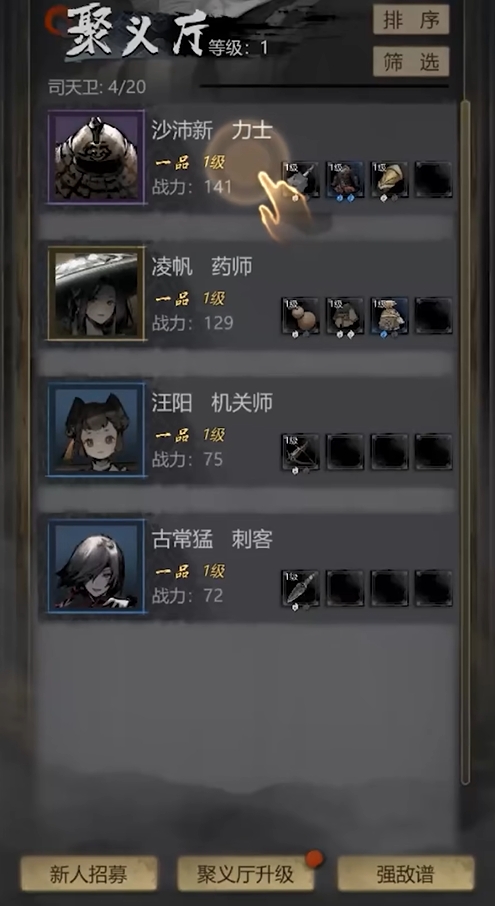 各位可通过聚义厅中的新人招募来进行抽卡,每次抽卡都会出现不同品级的侠士来供人们去挑选。侠士的品级可分为绝、极、甲、乙等多个不同的类别,其中绝品侠士为最高品阶,极品侠士次之,后续品级的侠士按甲、乙、丙降序排列。