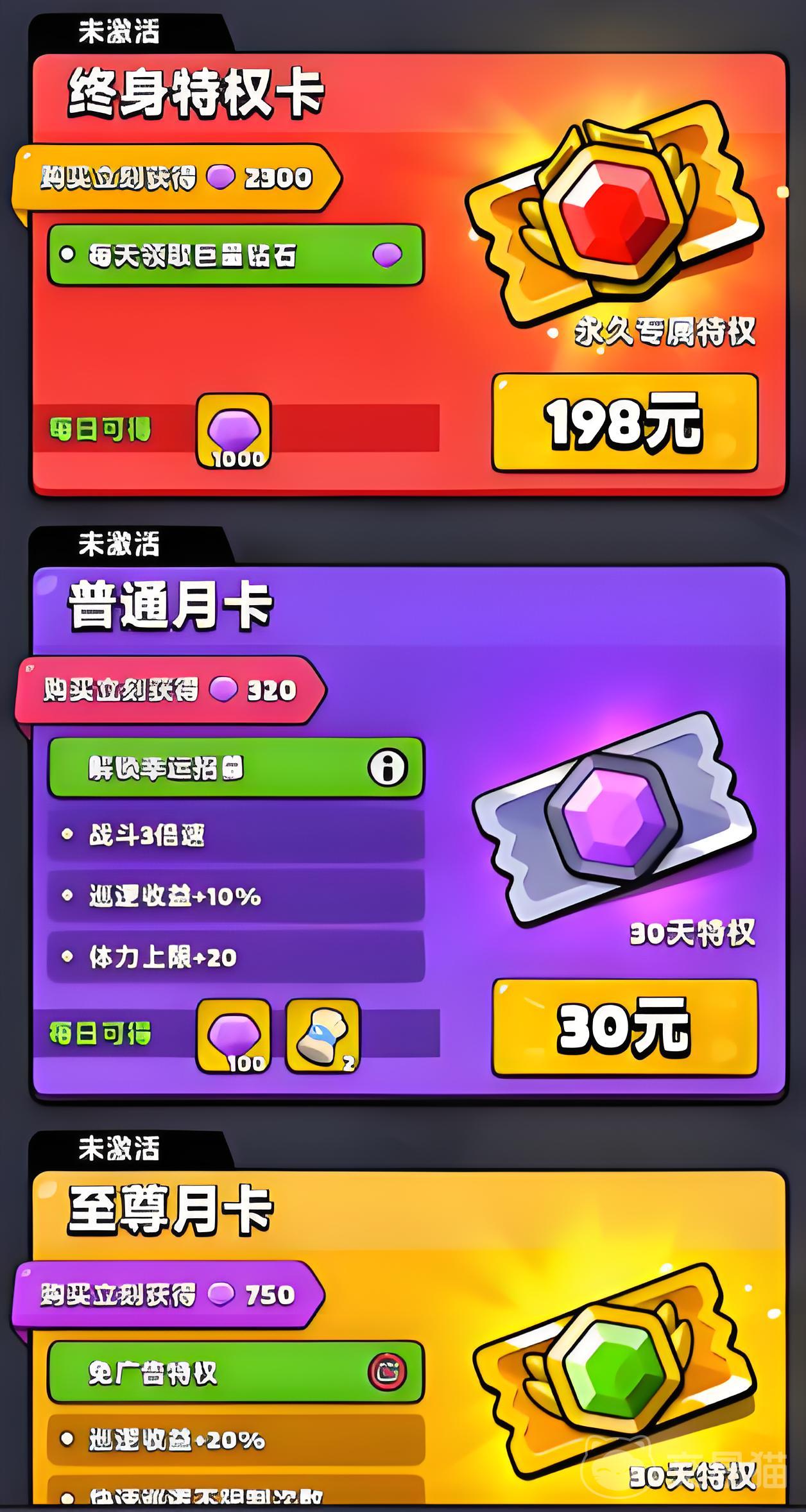 想要在游戏过程中能有好的游戏体验,关键在于玩家阵容的组建,也就是英雄的获得,因此在氪金上首推的必然是月卡,月卡分为3个档次,分别是30元的基础月卡和68元的至尊月卡以及198元的永久卡,建议选择30+68的组合,基础月卡能解锁3倍加速和100抽保底随机神话级别的英雄,还能每日获得20体力值,至尊月卡能让玩家在游戏过程中跳过广告且能无限巡逻,巡逻只要派遣英雄前往即可获得养成道具。这样的组合能加速玩家养成英雄的速度。