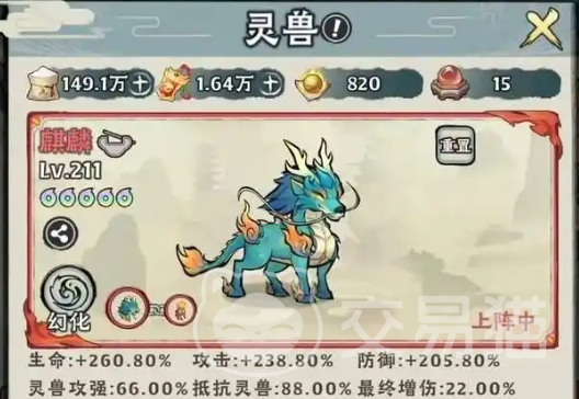 如果你拥有金乌血脉的话,那么麒麟这只灵兽与你再合适不过了。触发特殊状态之后,麒麟的暴击伤害将会增加150%,而攻速则会增加30%,这两项属性在金乌血脉的加持下将会进一步的提升。