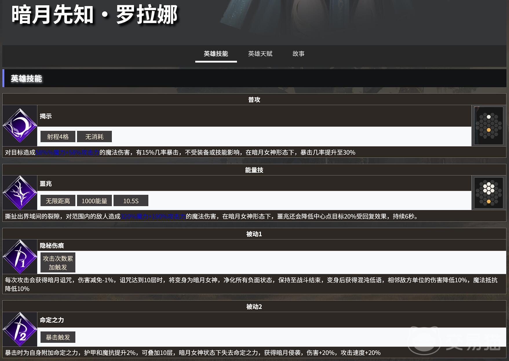 天赋方面,前期建议点左天赋“先知形态下揭示伤害提升”(增加120%魔法+120%攻击力的伤害),提升普攻的叠层效率,后期点右天赋“暗月女神形态下揭示伤害提升”(增加200%魔法+60%攻击力的伤害),强化变身的爆发能力。