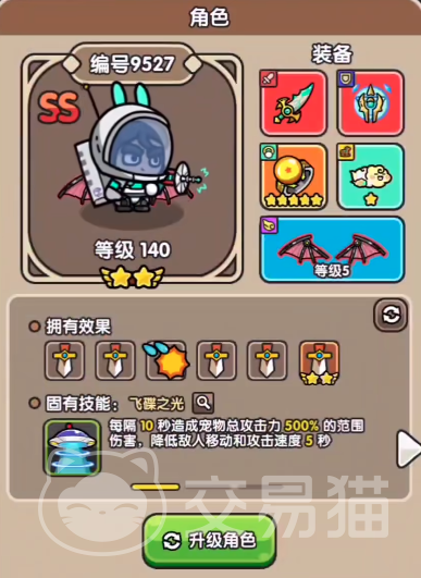编号9527是游戏里比较特殊的一个角色,这个造型会像外星人一样,这个角色除了有比较强力的装备之外,每隔10秒钟,还可以使用飞碟之光,带来大范围的伤害,除了单纯的伤害之外,还能降低移动速度,非常适合在各种对战场景下使用这个角色,减缓对方的行进速度之后,就可以进行更加猛烈的攻击。