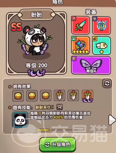 假如玩家想要的是一个,带有闪避或者是护盾类型的角色,那就可以选择盼盼,这个角色的外观形态也非常可爱,是一只大熊猫,每隔7秒钟的时间,就可以直接召唤这个角色向前滚动,这样角色会直接撞击对手,可以借助这种方式,带来所有宠物攻击力420%的范围伤害,非常适合用这个角色去参与竞技场,升级之后角色还有着较高的闪避能力。